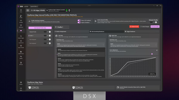Explore DSX's advanced features: modern UI, multi-controller support, and customizable profiles. Enjoy virtual controllers like Xbox 360, DualShock 4, and DualSense (DLC required). Experience dynamic haptic feedback, Adaptive Trigger support, and integrated LED modes.