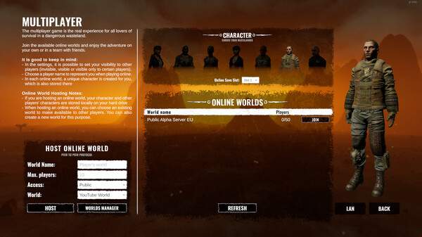 Post-apocalyptic multiplayer survival game with procedurally generated open world. Complete quests, master your skills, build bases, explore the world, trade, or conquer faction outposts. Endure the harsh conditions of the unforgiving wasteland!