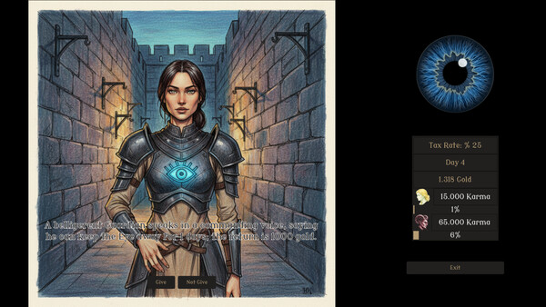Start as a small fruit wholesaler and earn your fortune! Will you remain honest, or get rich through bribery and risk the wrath of the 'Great Blue Eye'? Spend your earnings on good or evil to shape your Karma. Remember, the Eye only watches the sinners in this narrative-driven economy sim.